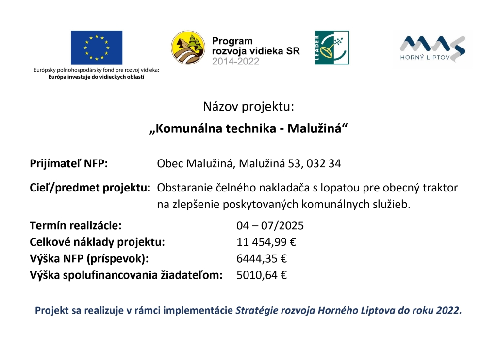 Ciel projektu: Obstaranie čelného nakladača s lopatou pre obecný traktor na zlepšenie poskytovaných komunálnych služieb.